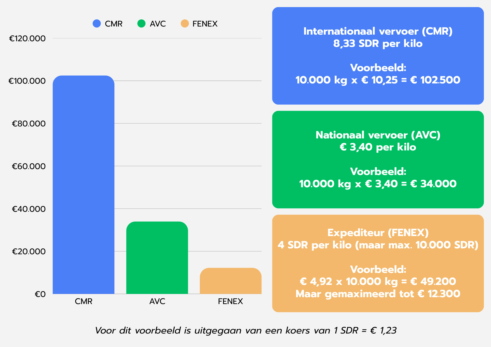Onderstaand voorbeeld verduidelijkt het verschil in aansprakelijkheid. In dit scenario wordt uitgegaan van een lading van 10.000 kg met een totale waarde van €150.000. Hieruit blijkt dat de aansprakelijkheid van de expediteur sterk beperkt kan zijn, mits de expediteur zich op de juiste wijze profileert.